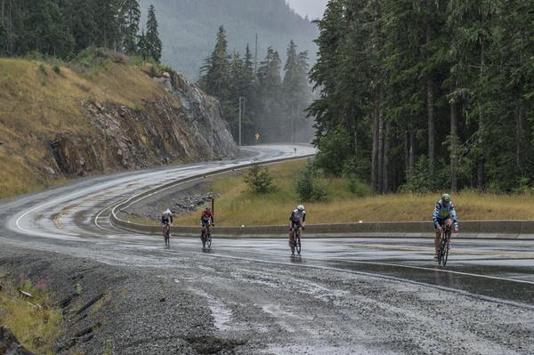 Part of what has drawn some of them to Whistler, even those, like Liz Lyles and Jeff Symonds, who are already a lock for Kona, is that the course is no joke. After a relatively calm lake swim, the athletes hit a hard and hilly bike course with two particularly long climbs—one of which comes painfully around 90 miles. They then ran through the rain partially on trails and partially on a rolling paved bike path, trying to avoid the local bears who have meandered across runners’ paths at past races.
